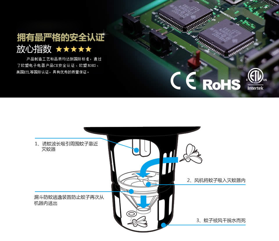 通过杜美丝UV灯管产生的360-400纳米波长,吸引周围的蚊子靠近光源,当蚊子接近光源时,风机产生的气流能迅速把蚊子吸入灭蚊器的储蚊盒内,进而被风干脱水致死。